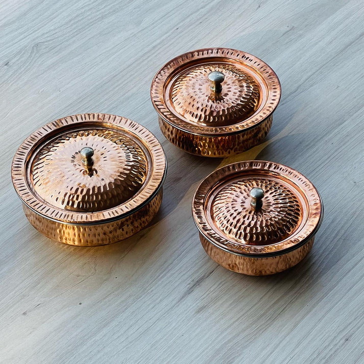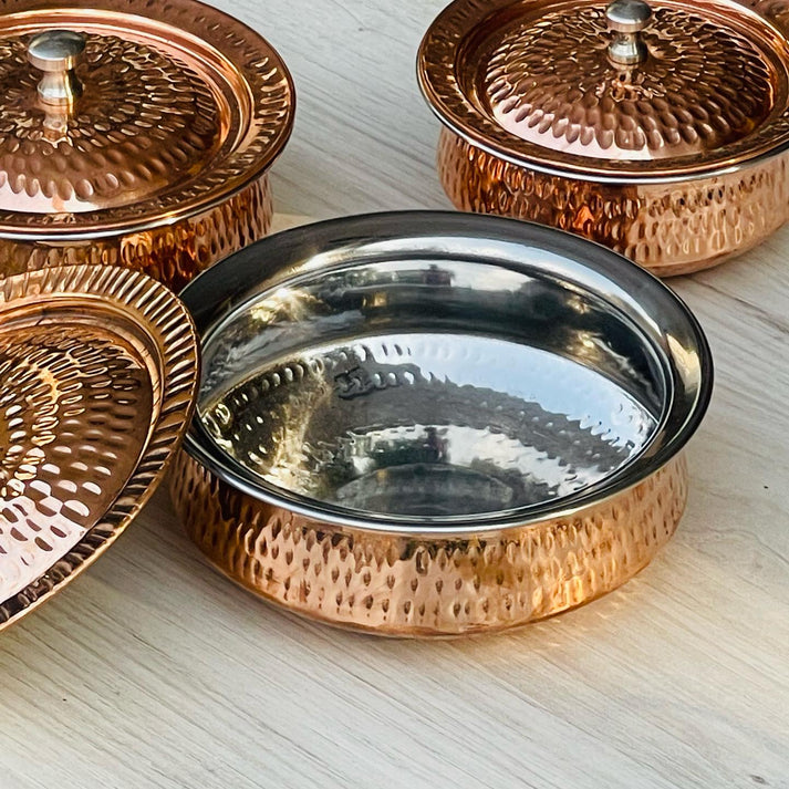 Each handi is skillfully handcrafted, featuring a hammered copper finish that reflects the artistry of a bygone era. The interior is lined with high-quality stainless steel, keeping your dishes warm and flavorful, just as they would be in a royal feast.